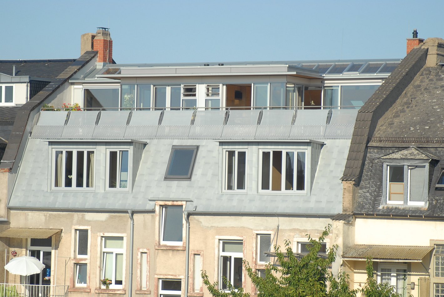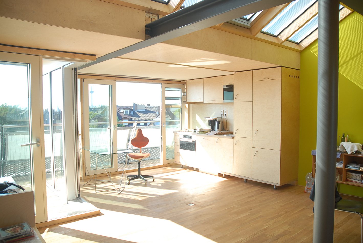De nieuwe zolderverbouwing voor woondoeleinden creëerde hoogwaardige, moderne ruimten om de bestaande woonruimte aan te vullen en te vergroten. Het hoogtepunt van het appartement van de architect zijn de aantrekkelijke dakterrassen op de hoogste verdieping van het gebouw, vanwaar men een schitterend uitzicht heeft in westelijke richting naar het centrum van de stad en tot in het Taunusgebergte. Volgens de planner "was ik in staat om optimale lichtomstandigheden te creëren door grote glasoppervlakken te gebruiken en tegelijkertijd rekening te houden met effectieve warmte- en zonwering. Zo kun je echt genieten van de grote kamers!"