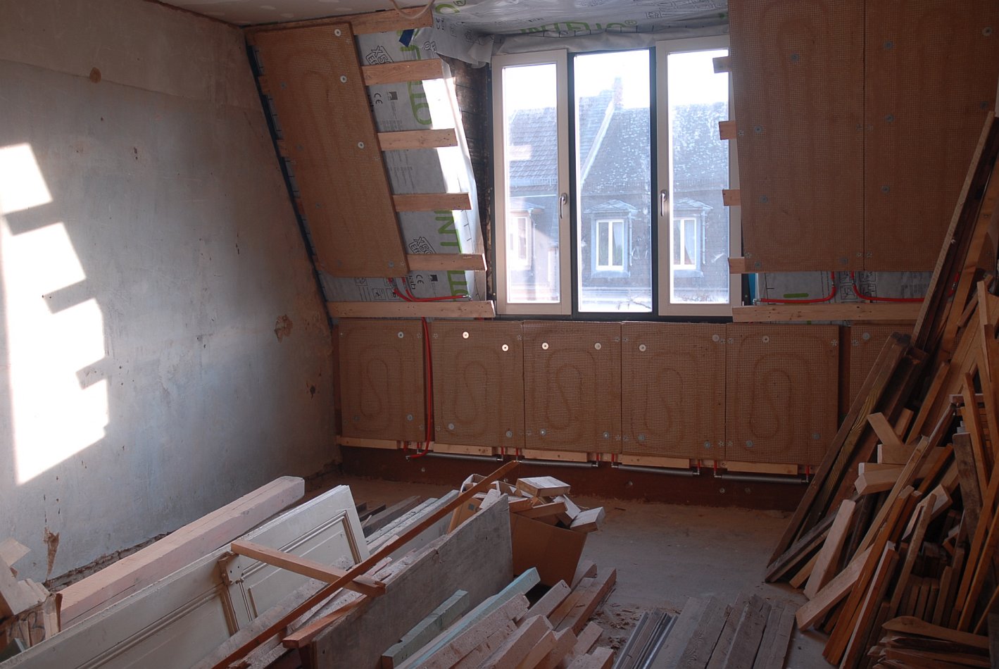 De architect werkte met klimaatelementen in het plafond en met het buizensysteem op massieve muren, die vervolgens met leem werden bepleisterd.