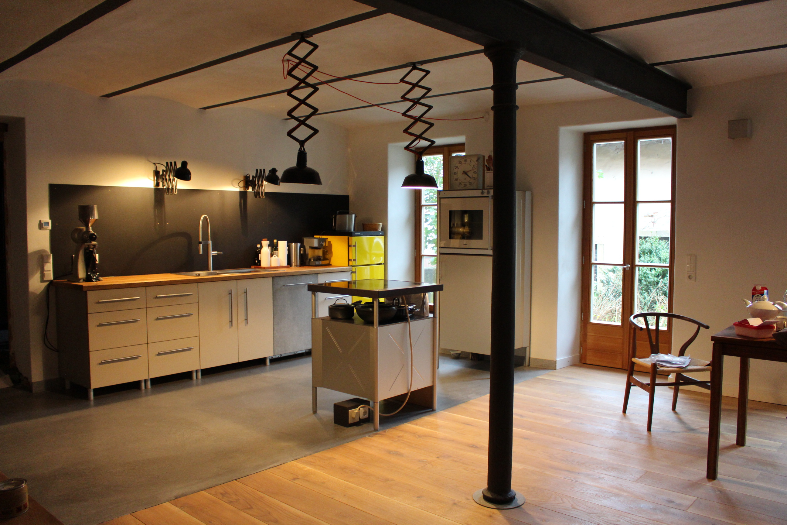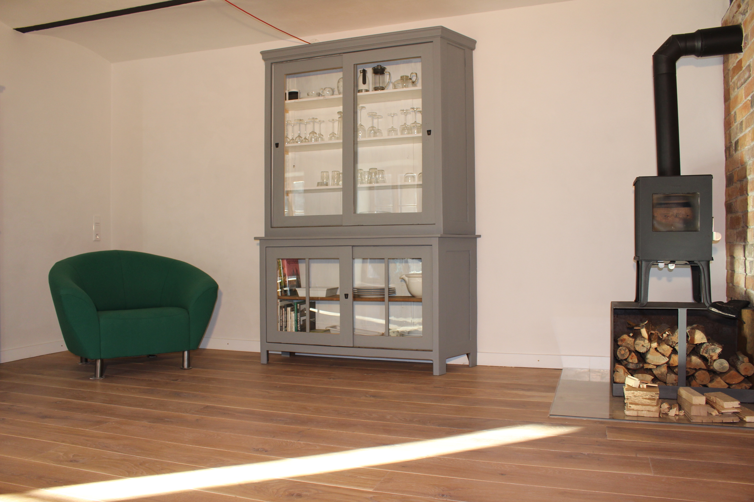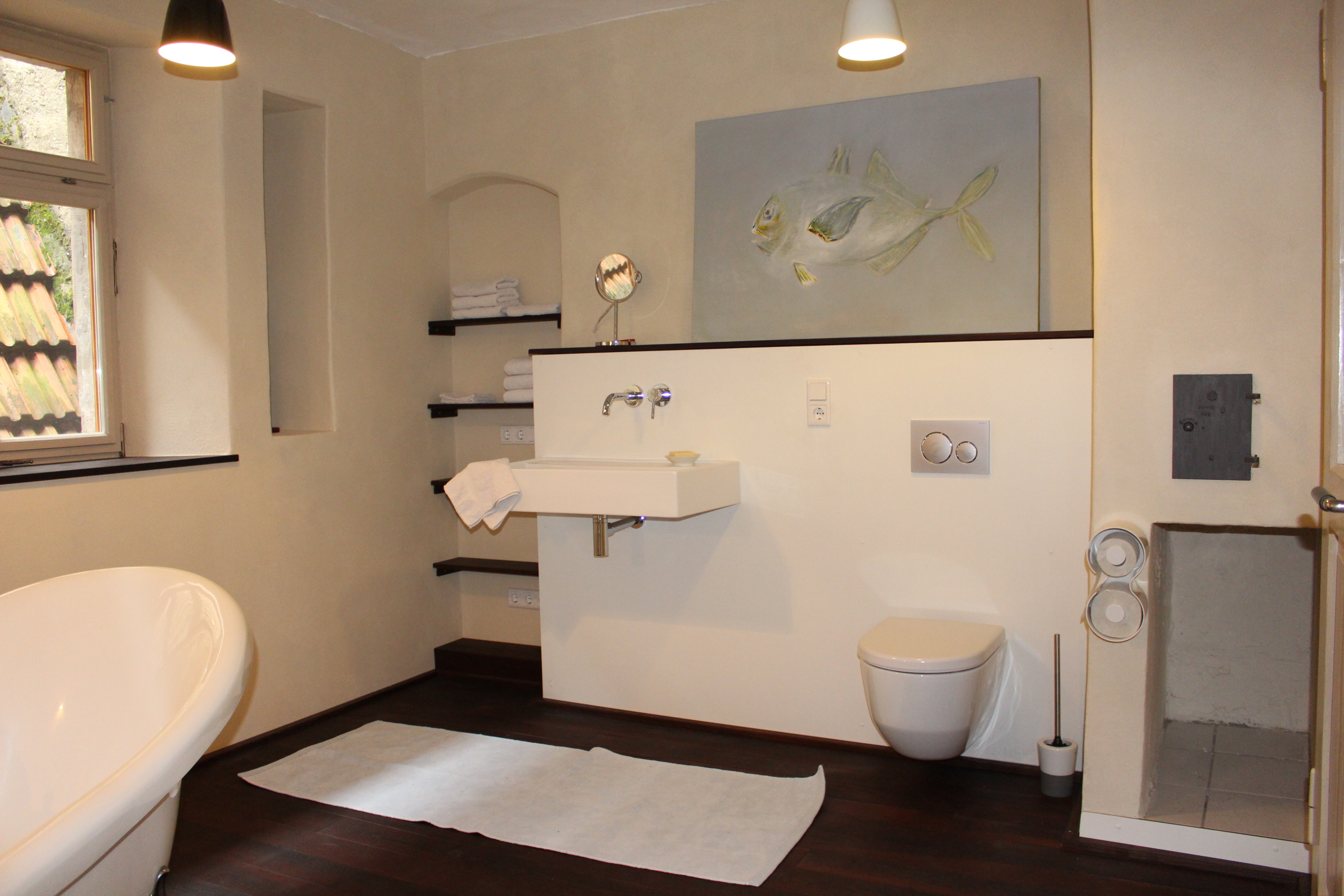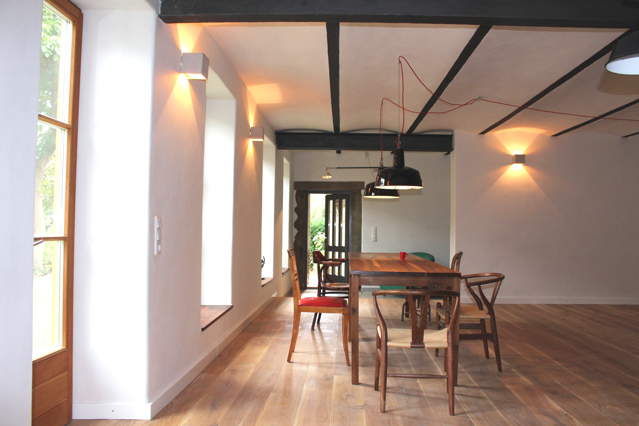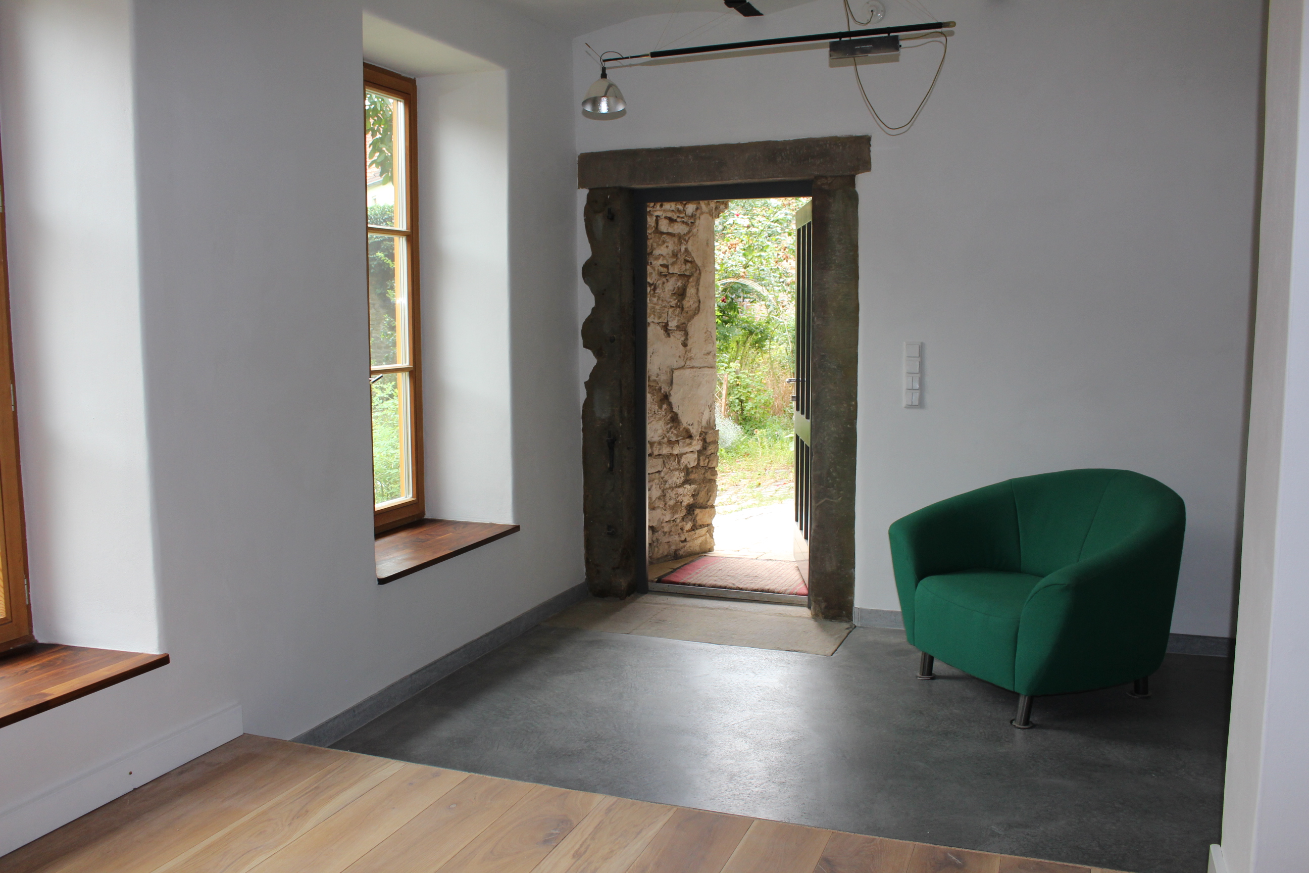 Complete renovatie van een oud wijnbouwershuis in de buurt van Würzburg met compatibele, ecologische bouwmaterialen. Aanbrengen van binnenisolatie, wandverwarming, leempleisters en leemverf. Gedeeltelijk vloertemperatuurregeling. Koelings-elementen op muren en op zolder. Leempleister op het Pruisische kapplafond. Isolatie op breuksteenmuren in het interieur en bekleding met klimaatregisters, bepleisterd met leem universele pleister. Afwerking met leem fijnpleister en leemverf in "bloesem wit".
